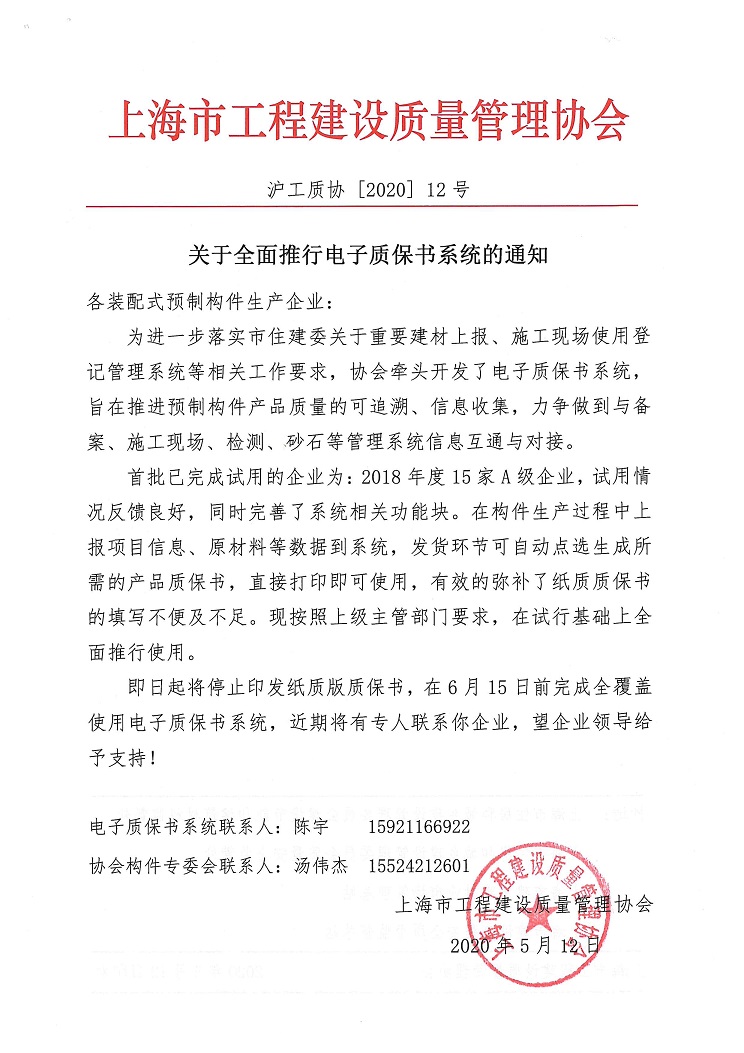 为进一步落实市住建委关于重要建材上报、施工现场使用登记管理系统等相关工作要求,协会牵头开发了电子质保书系统,旨在推进预制构件产品质量的可追溯、信息收集,力争做到与备案、施工现场、检测、砂石等管理系统信息互通与对接。