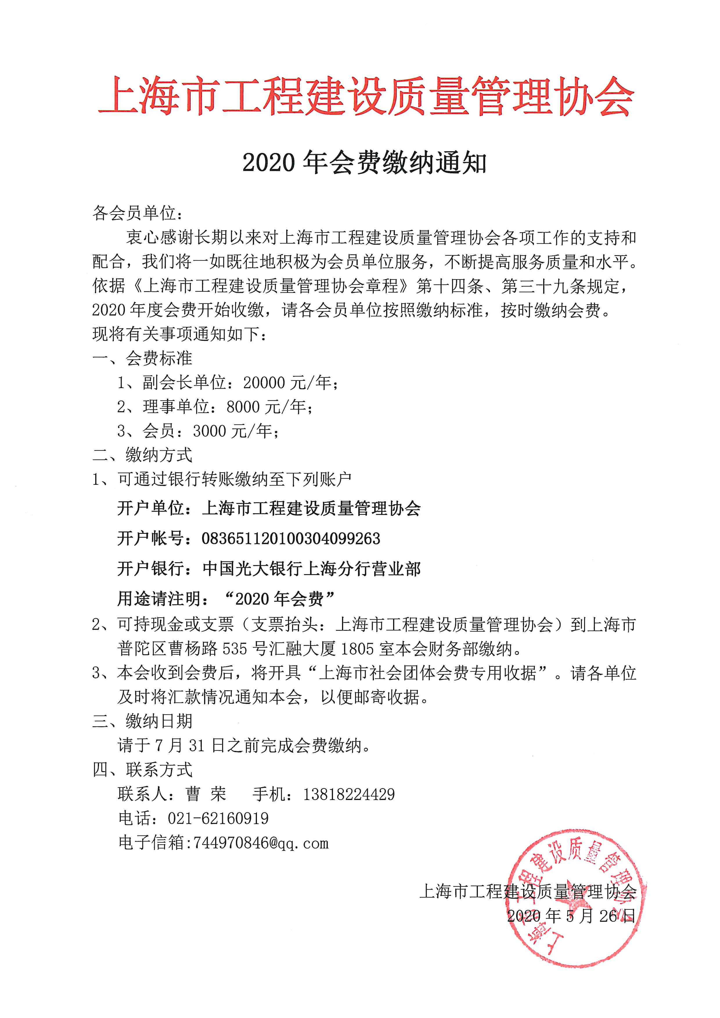 衷心感谢长期以来对上海市工程建设质量管理协会各项工作的支持和配合,我们将一如既往地积极为会员单位服务,不断提高服务质量和水平。依据《上海市工程建设质量管理协会章程》第十四条、第三十九条规定,2020年度会费开始收缴,请各会员单位按照缴纳标准,按时缴纳会费。