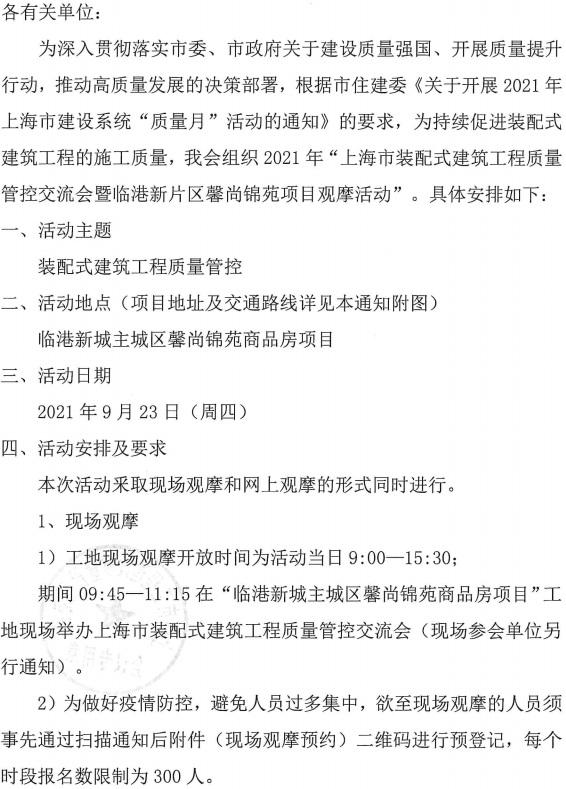 关于2021年上海市装配式建筑工程质量管控交流会暨临港新片区馨尚景苑项目观摩活动的通知
