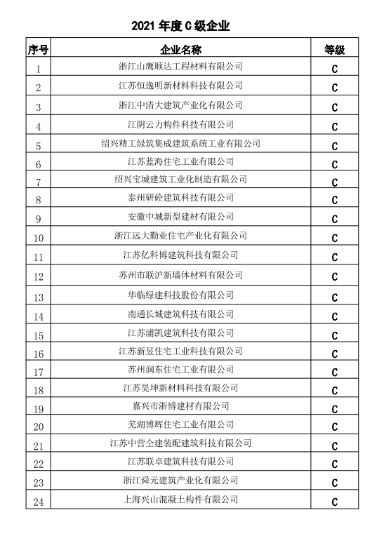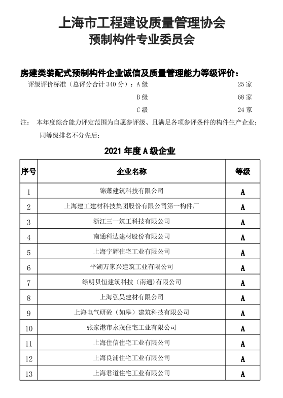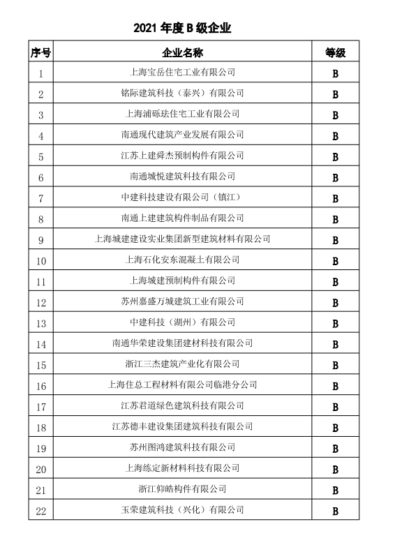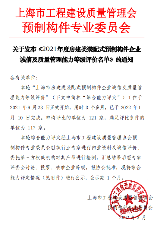 关于发布《2021年度房建类装配式预制构件企业诚信及质量管理能力等级评价名单》的通知