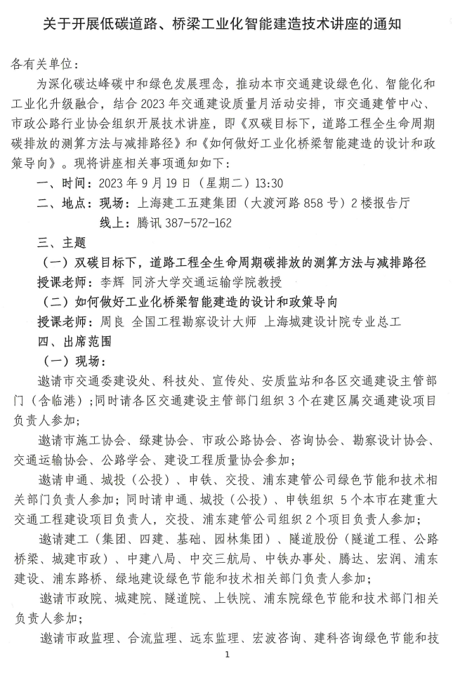 关于转发 市交通委建管中心即将开展《关于开展低碳道路、桥梁工业化智能建造技术讲座的通知》