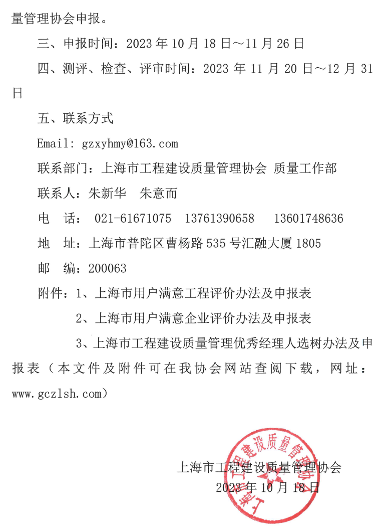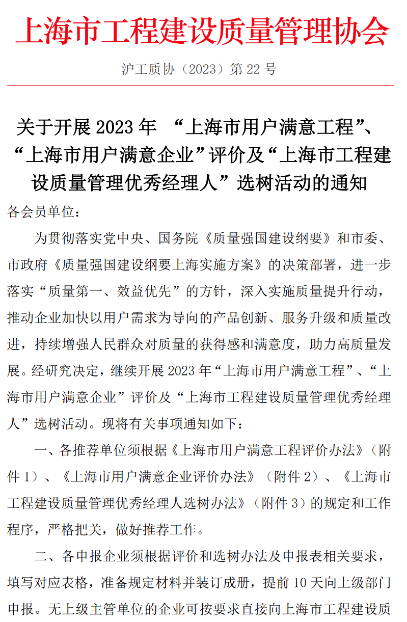 关于开展2023年“上海市用户满意工程”、“上海市用户满意企业”评价及“上海市工程建设质量管理优秀经理人”选树活动的通知