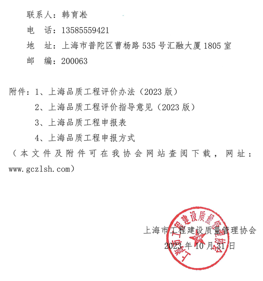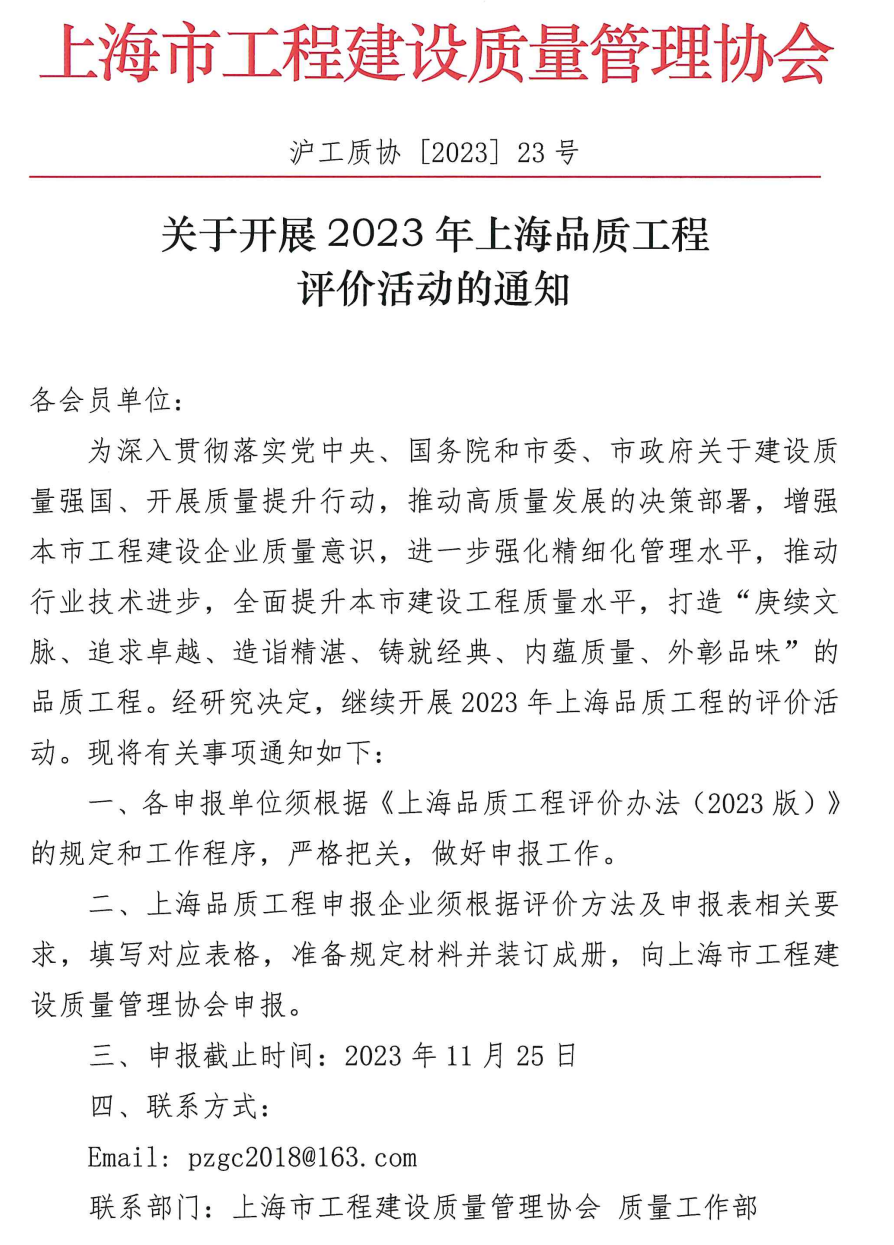 关于开展2023年上海品质工程评价活动的通知