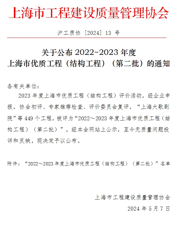 关于公布2022~2023年度上海市优质工程(结构工程)(第二批)的通知