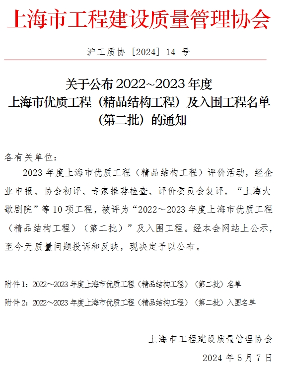 关于公布2022~2023年度上海市优质工程(精品结构工程)及入围工程名单(第二批)的通知