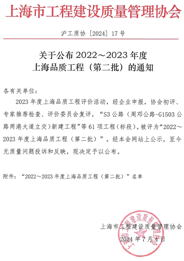 关于公布2022~2023年度 上海品质工程(第二批)的通知