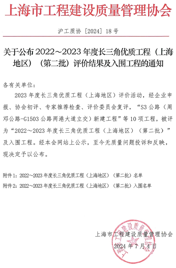 关于公布2022~2023年度长三角优质工程(上海 地区)(第二批)评价结果及入围工程的通知