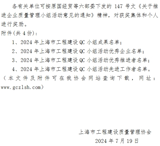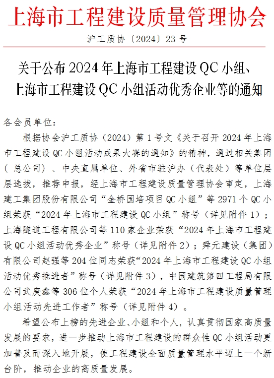 关于公布2024年上海市工程建设QC小组、上海市工程建设QC小组活动优秀企业等的通知