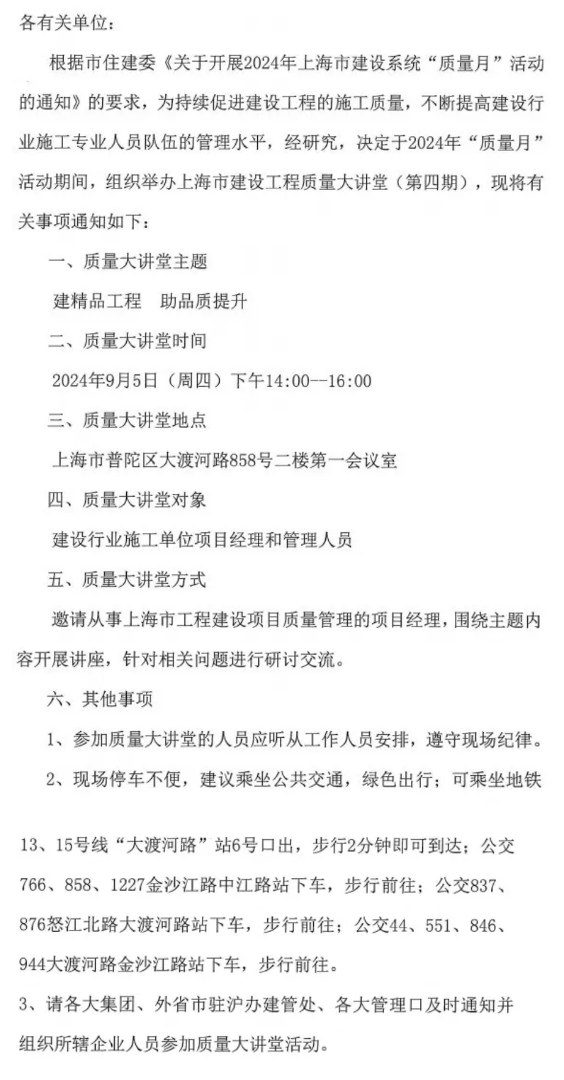 关于举办2024年上海市建设工程质量大讲堂的通知