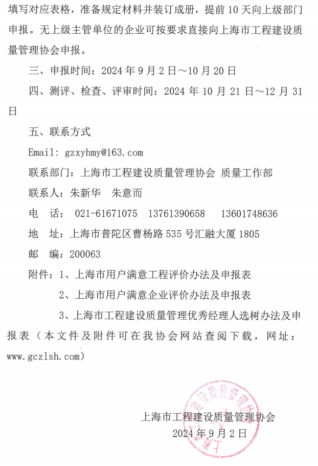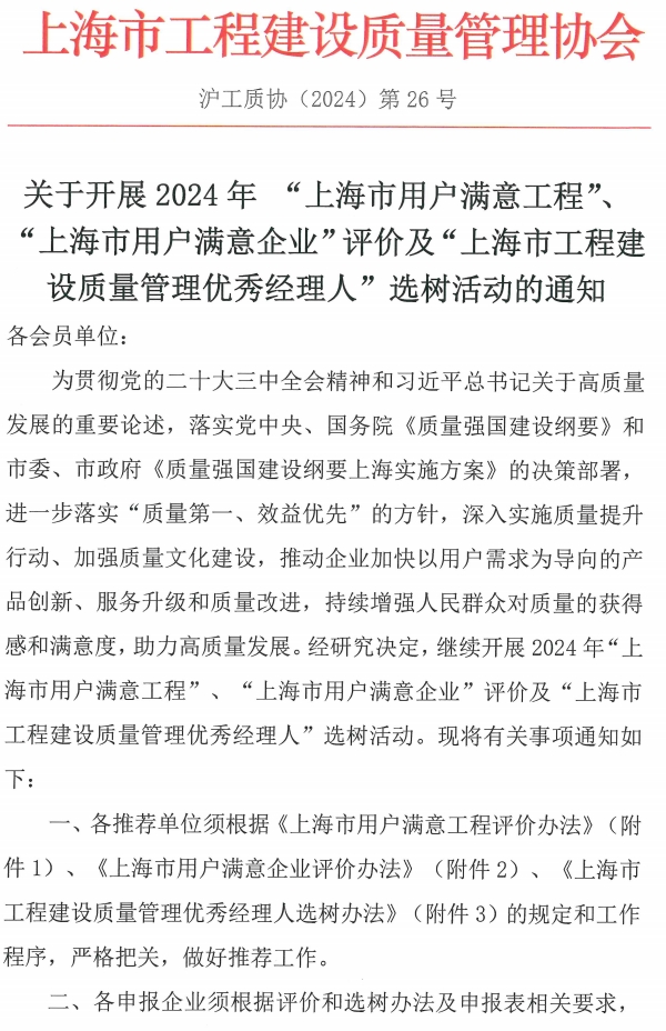关于开展2024年“上海市用户满意工程”、“上海市用户满意企业”评价及“上海市工程建设质量管理优秀经理人”选树活动的通知