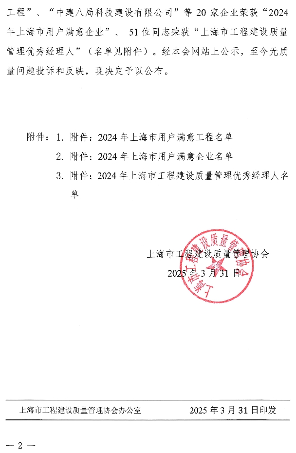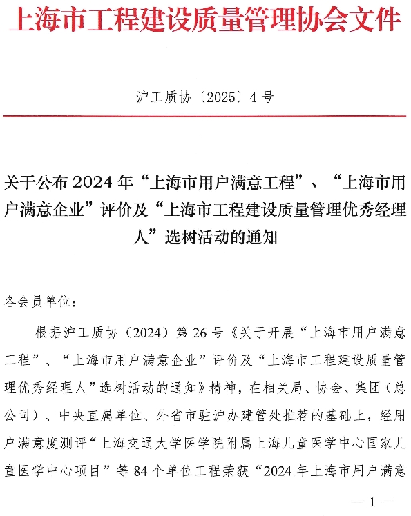 关于公布2024年“上海市用户满意工程”“上海市用户满意企业”评价及“上海市工程建设质量管理优秀经理人”选树活动的通知