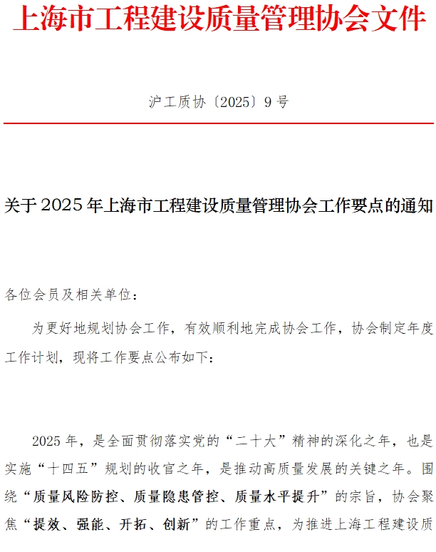 关于2025年上海市工程建设质量管理协会工作要点的通知