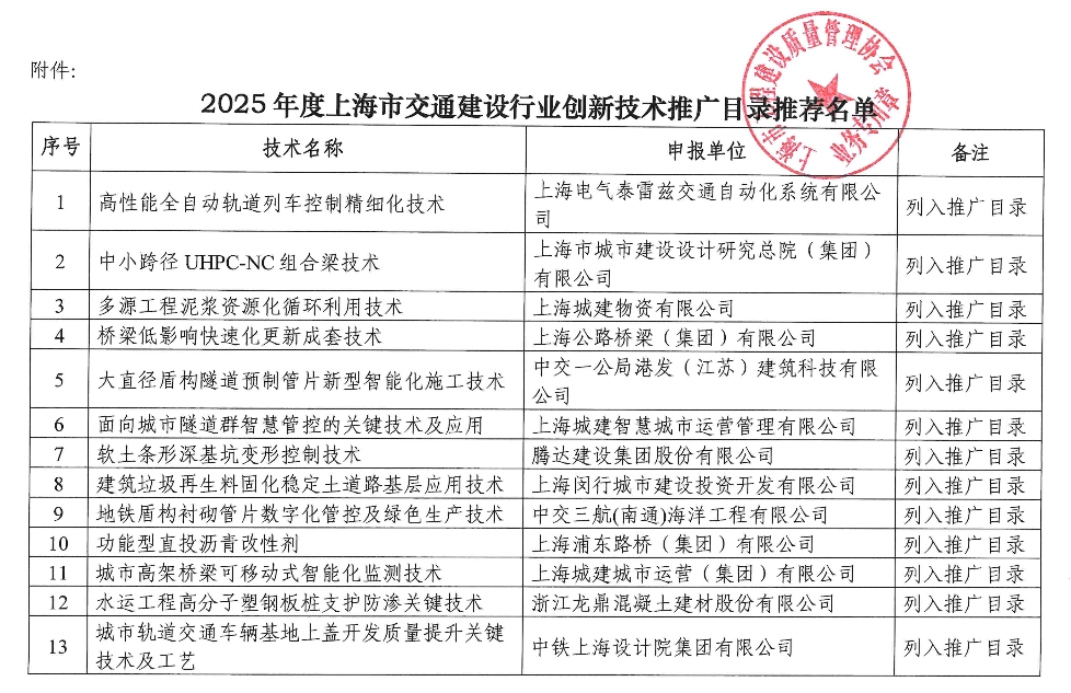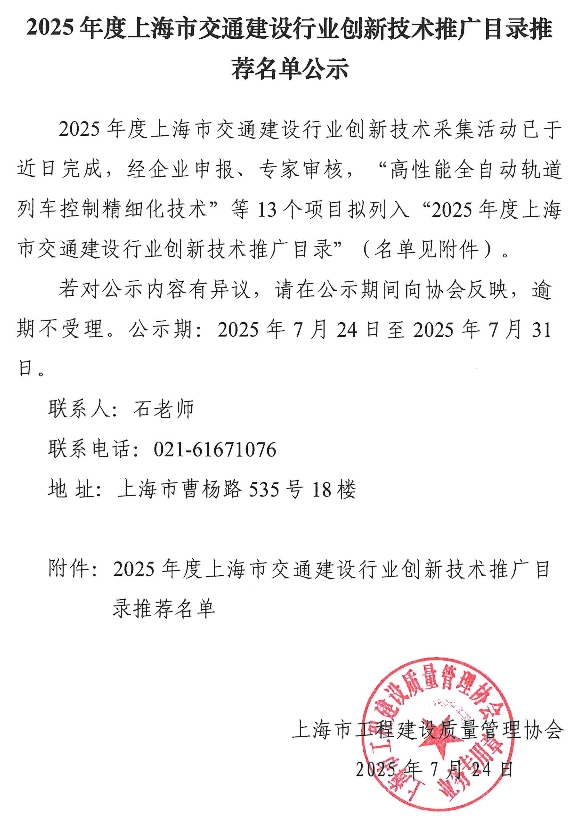 2025年度上海市交通建设行业创新技术推广目录推荐名单公示