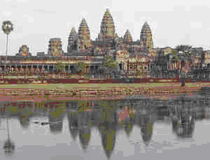 吴哥窟占地195万平方米,其中的山形庙中心塔高65米,是柬埔寨的象征,被印在国旗上。