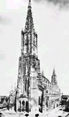 德国还有一种只在教堂正面建一座很高钟塔的哥特式教堂。著名的例子是乌尔姆主教堂。它的钟塔高达161米,控制着整个建筑构图,可谓中世纪教堂建筑中的奇观。砖造教堂在北欧很流行,德国北部也有不少砖造的哥特式教堂。
