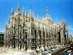 意大利最著名的哥特式教堂是米兰大教堂,它是欧洲中世纪最大的教堂之一,14世纪80年代动工,直至19世纪初才最后完成。教堂内部由四排巨柱隔开,宽达 49米。中厅高约45米,而在横翼与中厅交叉处,更拨高至65米多,上面是一个八角形采光亭。中厅高出侧厅很少,侧高窗很小。内部比较幽暗,建筑的外部全由光彩夺目的白大理石筑成。高高的花窗、直立的扶壁以及 135座尖塔,都表现出向上的动势,塔顶上的雕像仿佛正要飞升。西边正面是意大利人字山墙,也装饰着很多哥特式尖券尖塔。但它的门窗已经带有文艺复兴晚期的风格。